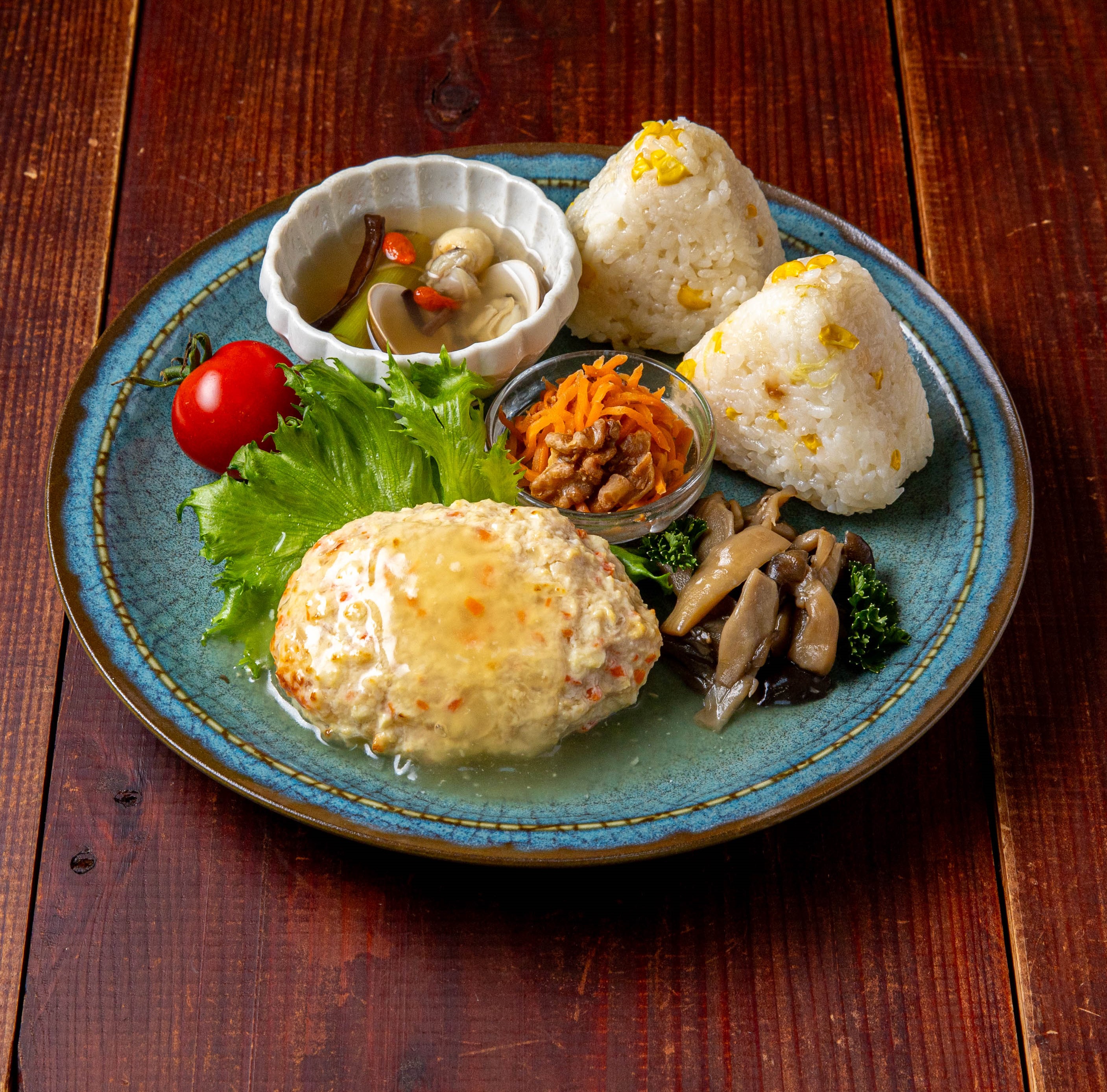 京豆腐の和風餡かけハンバーグ きのこのソテー 人参とクルミの和え物 蛤の薬膳スープ アレルギー:くるみ、鶏肉、大豆、小麦 |