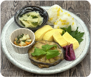 ゆばのお吸い物 丸ナスのはさみ焼き せろりの胡麻和え 出汁巻き玉子 アレルギー:とうもろこし、小麦、鶏肉、ごま、セロリ、卵、大豆 |